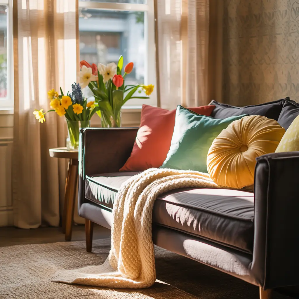 - Pillows: Swap the heavy velvets for light yellow or mint green linens.