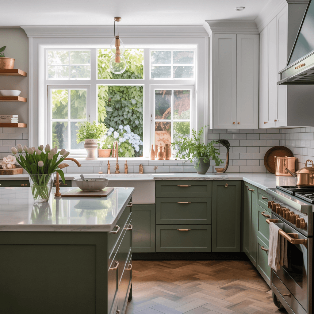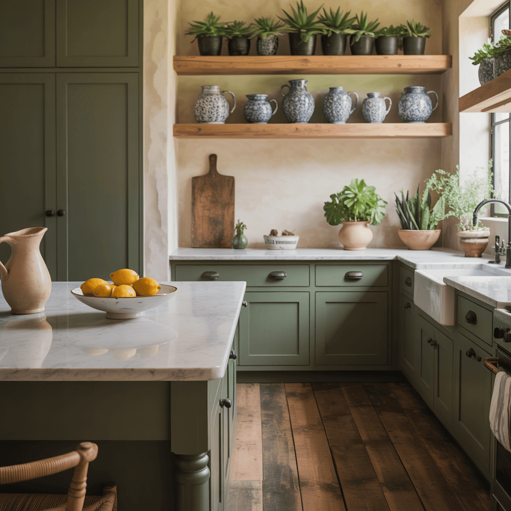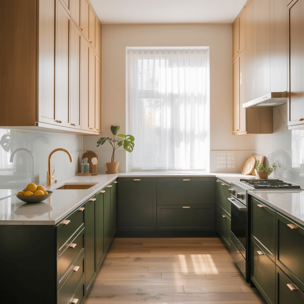 The trick is choosing the right beige – you want something with depth, maybe a greige or mushroom tone rather than basic builder beige. Use the green on your island or lower cabinets, and let the beige handle the uppers or perimeter cabinets. This creates a balanced, harmonious look that won’t overwhelm your space.