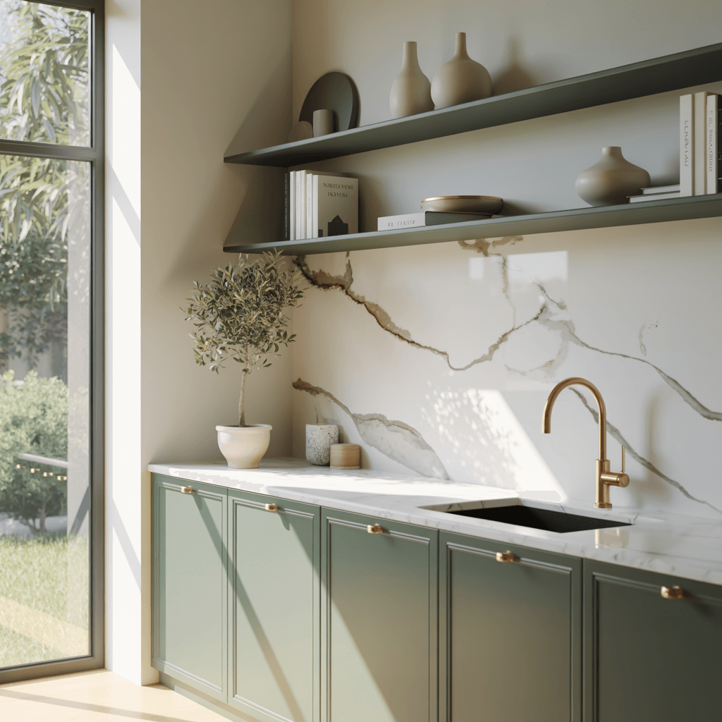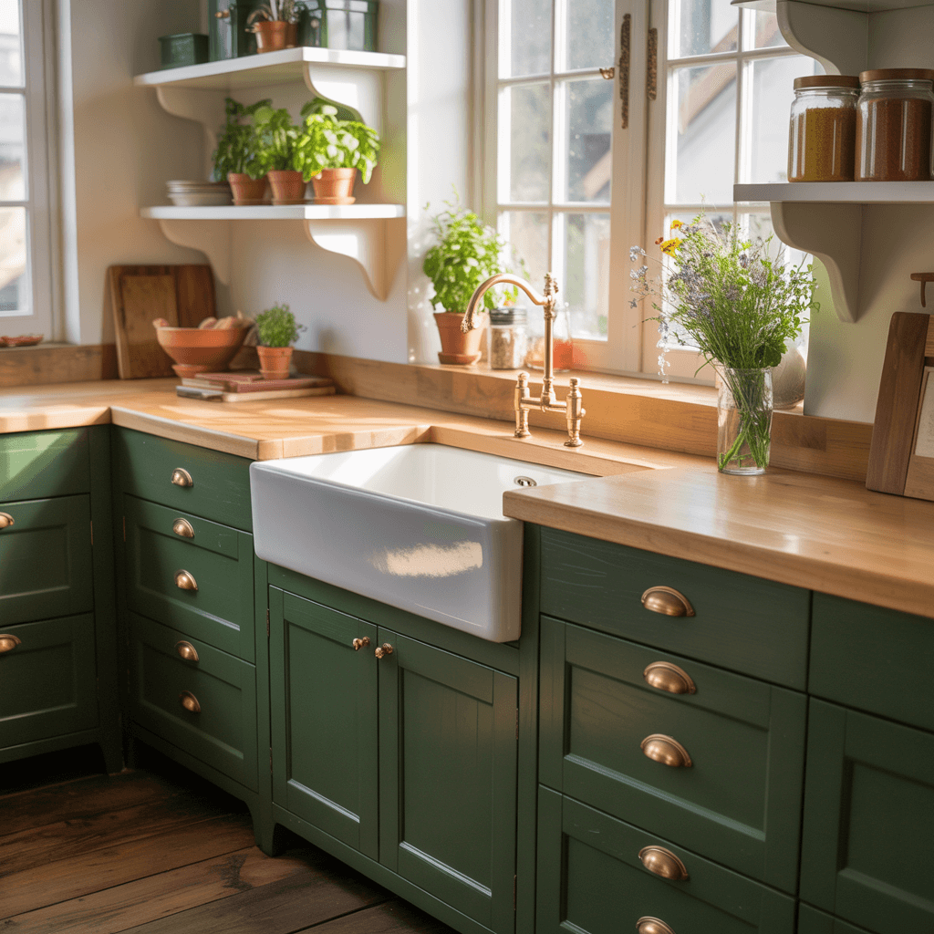The key here is choosing the right shade of green. You want something that feels organic and natural – think sage, forest, or hunter green rather than anything too bright or artificial. A white apron-front sink against these darker tones creates this beautiful focal point that draws the eye immediately.