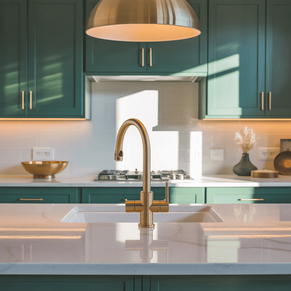 Okay, if brass is too subtle for you, let’s talk about going full glam with gold accents. Dark green and gold together? That’s some serious Great Gatsby energy right there. I’m talking gold faucets, gold cabinet hardware, maybe even a gold range hood if you’re feeling extra.