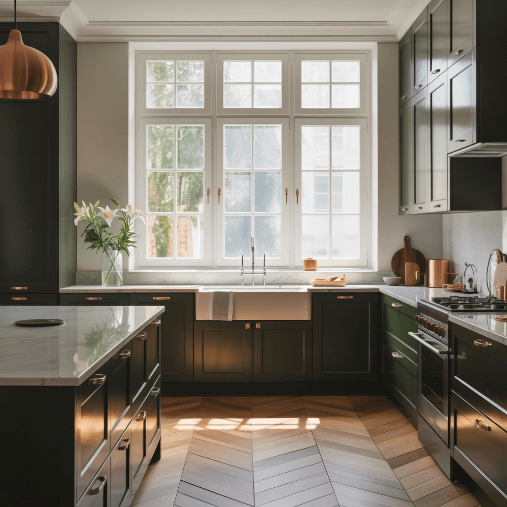 Want to know what really makes dark green cabinets sing? Herringbone flooring. The geometric pattern adds movement and interest to your kitchen floor, while the dark green cabinets provide a bold backdrop. This combination feels both classic and contemporary, which is honestly hard to pull off.
