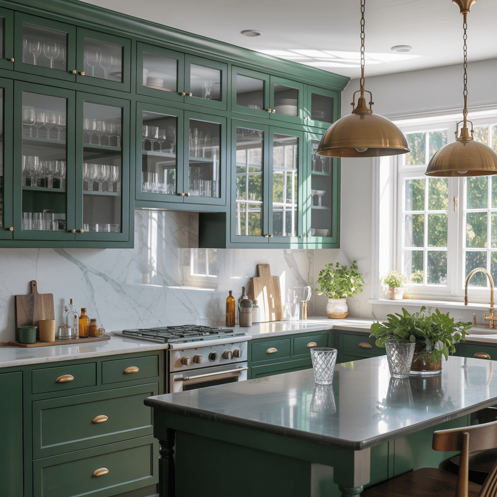 Listen, glass-front cabinets might seem scary (what if people see my mismatched mugs?), but when you pair them with dark green frames, magic happens. The glass breaks up the solid color, preventing your kitchen from feeling too heavy while still maintaining that gorgeous green presence.