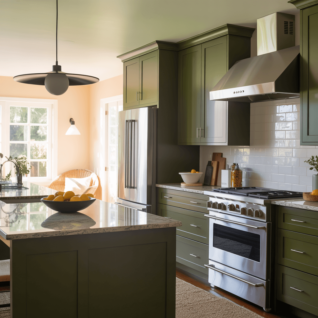 Dark Green Kitchen Paired with Stainless Steel Appliances
