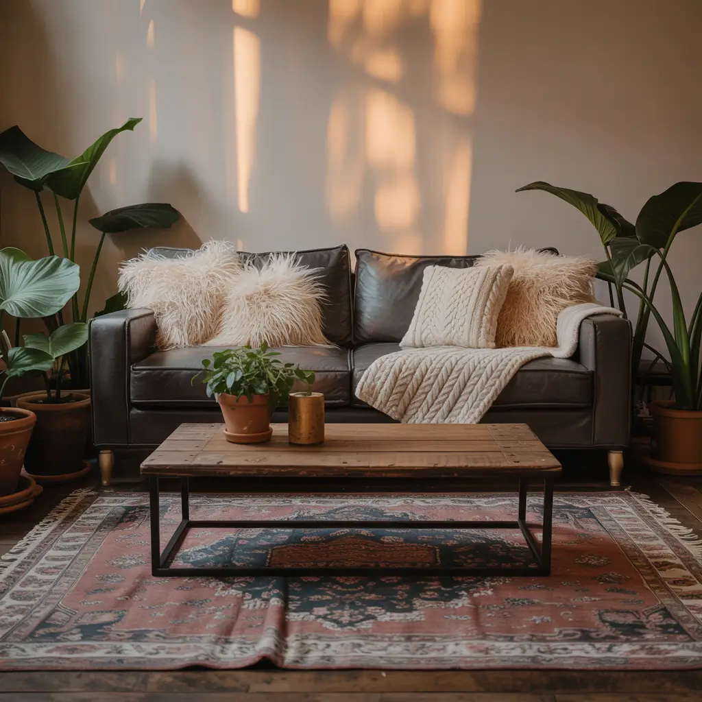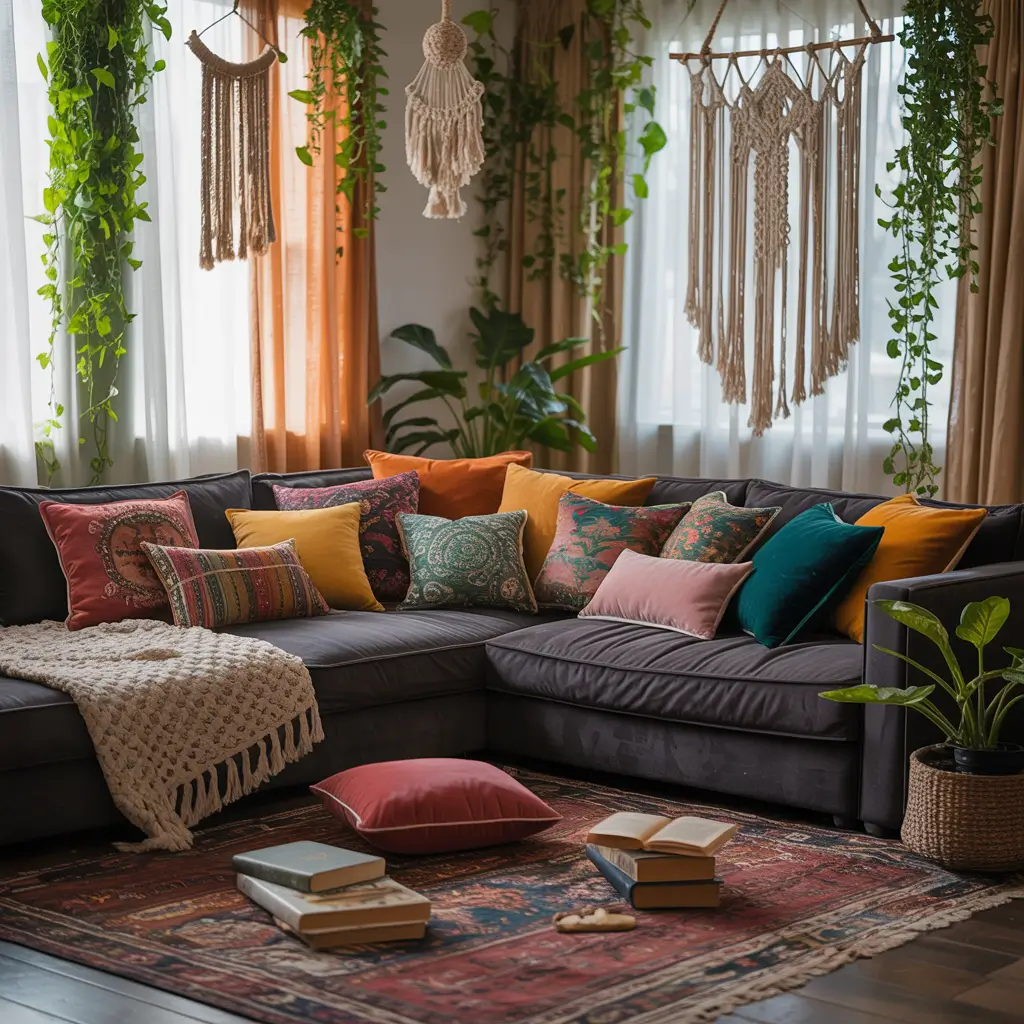 These warm tones counteract any coolness in your charcoal couch and create a space that feels like a warm hug rather than a moody cave.