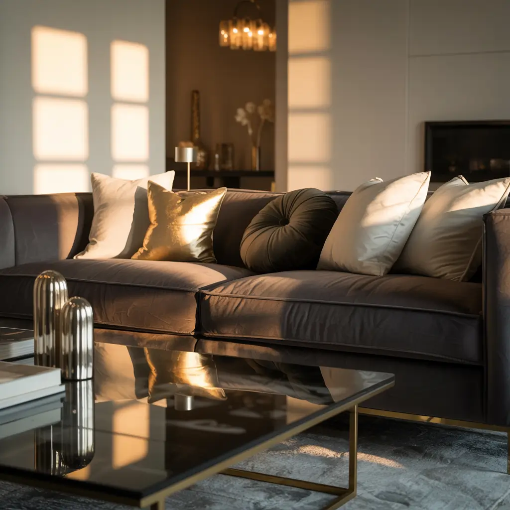 Metallic accents transform a dark grey couch from sophisticated to genuinely glamorous. The interplay between matte dark fabric and reflective metallic surfaces creates visual richness that elevates any living room.