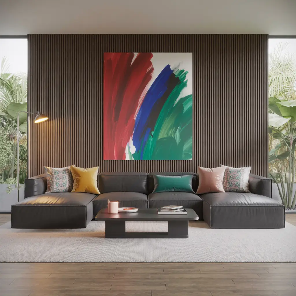 Statement wall art finds its perfect partner in a dark grey couch. The neutral, sophisticated backdrop lets artwork command attention without competing elements.
