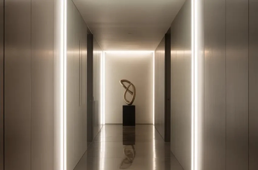 Contemporary design in dark hallways means clean lines, minimal fuss, maximum impact. Think high-end hotel corridor meets residential comfort. Everything has a purpose, nothing’s there just because.