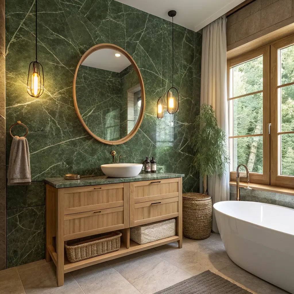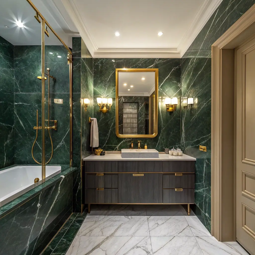 Verde Guatemala or Empress Green marble creates this insanely rich backdrop that makes everything else in your bathroom look expensive by association. Pair it with gold fixtures (not brass—actual gold-toned hardware), and suddenly you’re living in an emerald palace.