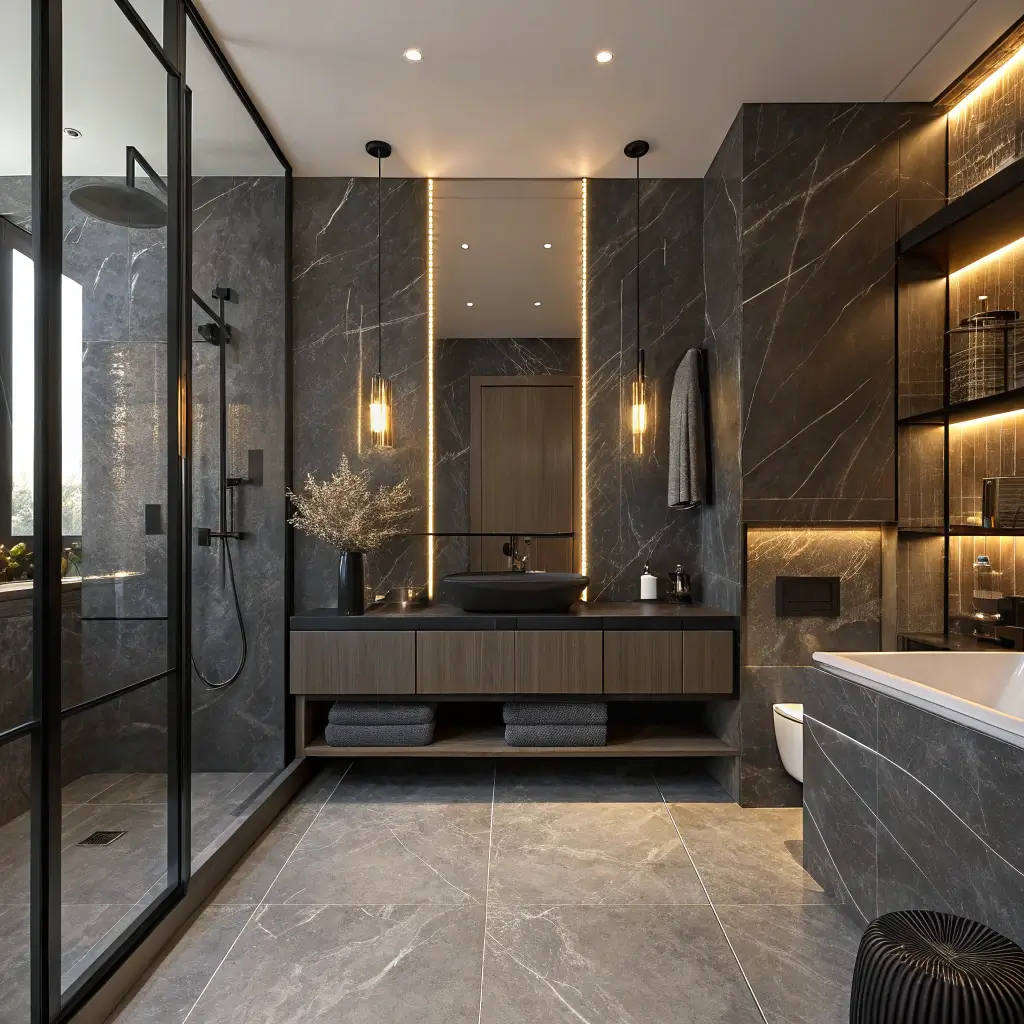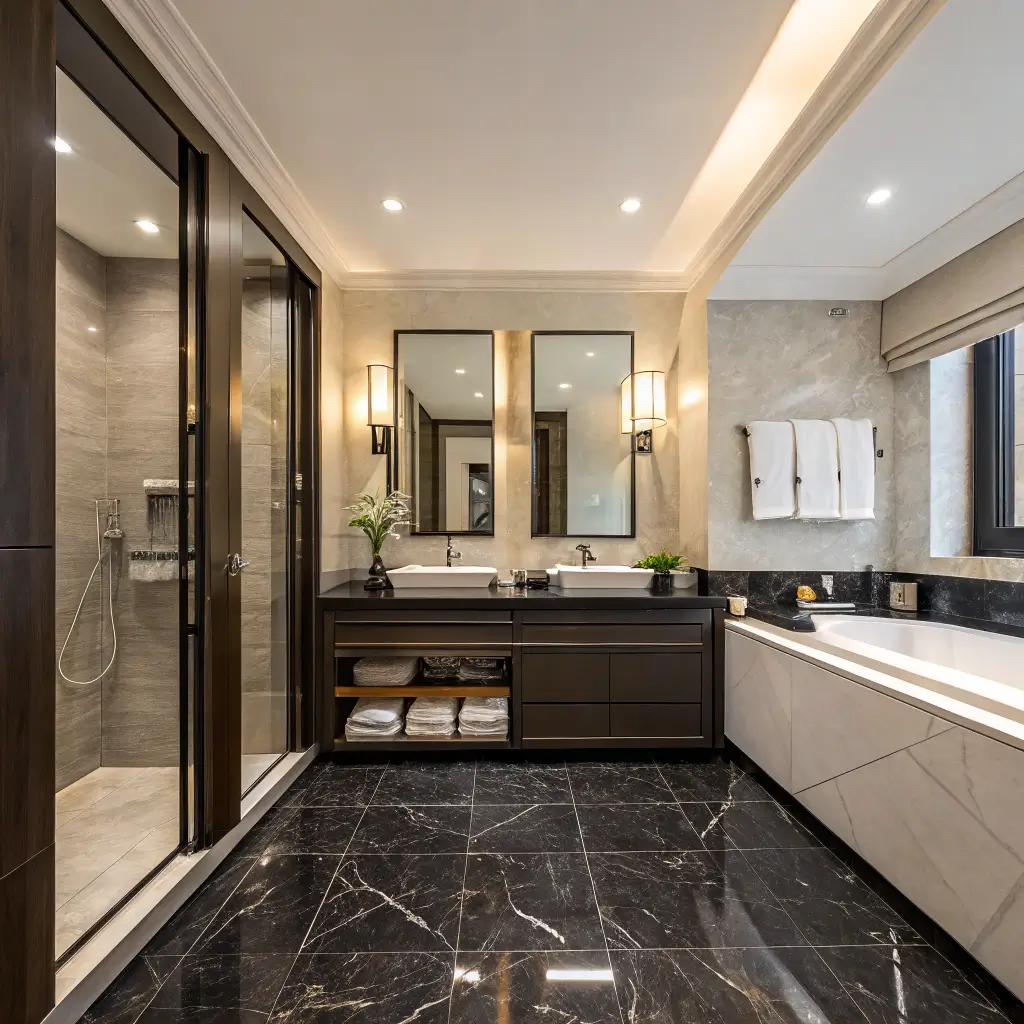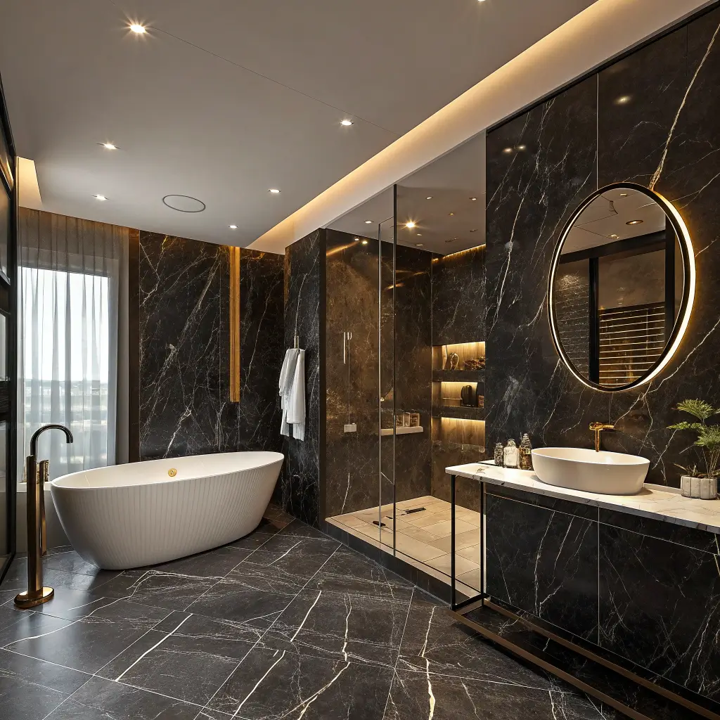 The trick with black marble is balancing the darkness with the right lighting. You want warm, layered lighting—think wall sconces at eye level, maybe some LED strips under floating vanities. Trust me, harsh overhead lights will kill the vibe faster than you can say “relaxation.”