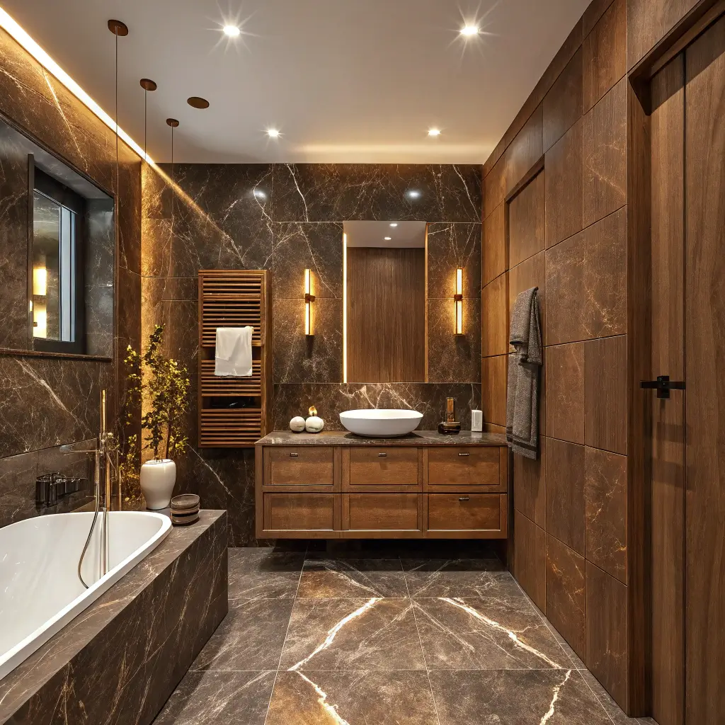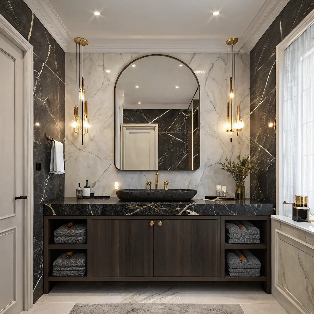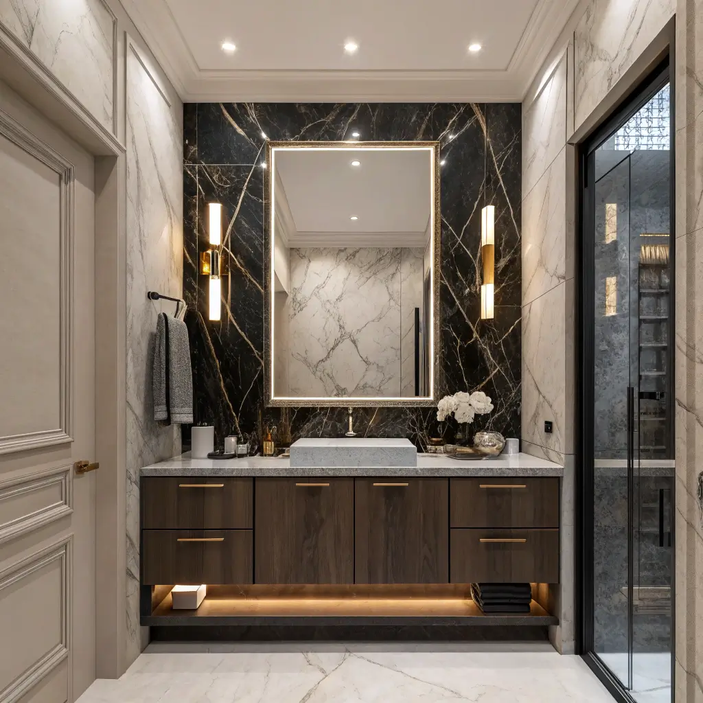I stumbled onto this combination accidentally when I ran out of budget for wall marble. Best mistake ever. The contrast creates this visual interest that all-dark or all-light bathrooms just can’t achieve.