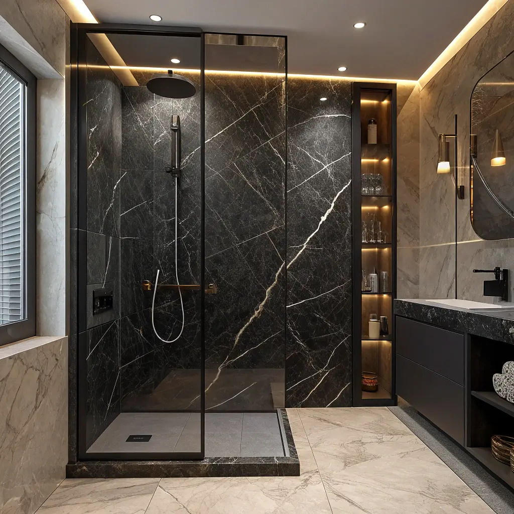 Can we just appreciate heavily veined black marble in showers for a second? It’s like having abstract art you can shower in. Every piece is unique—nature’s own masterpiece right there in your bathroom.