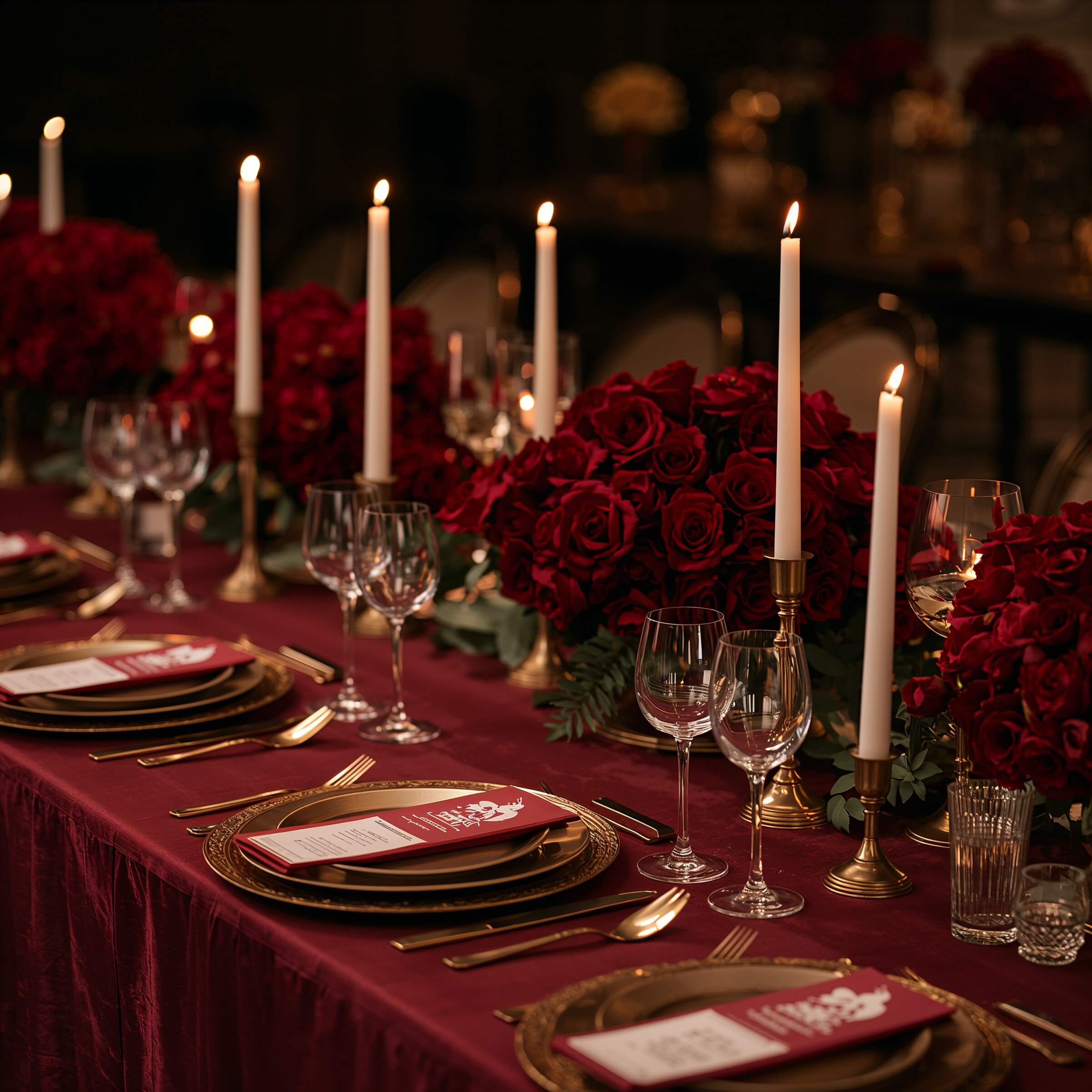 The beauty of this color palette is its versatility. Deep reds work beautifully in rustic barn settings, elegant ballrooms, intimate garden parties, or dramatic industrial spaces. The candlelight adapts to any environment, creating warmth and romance wherever you are.