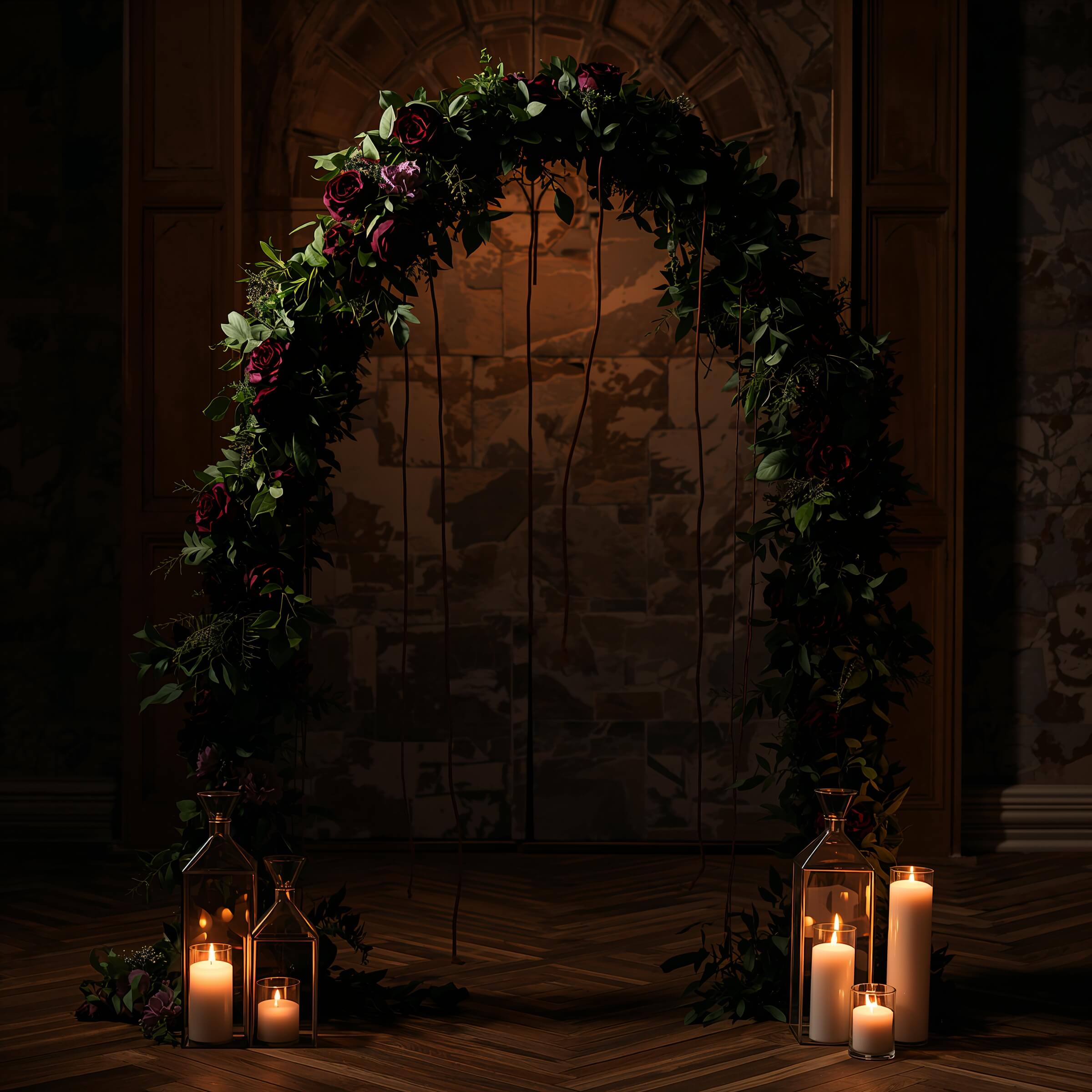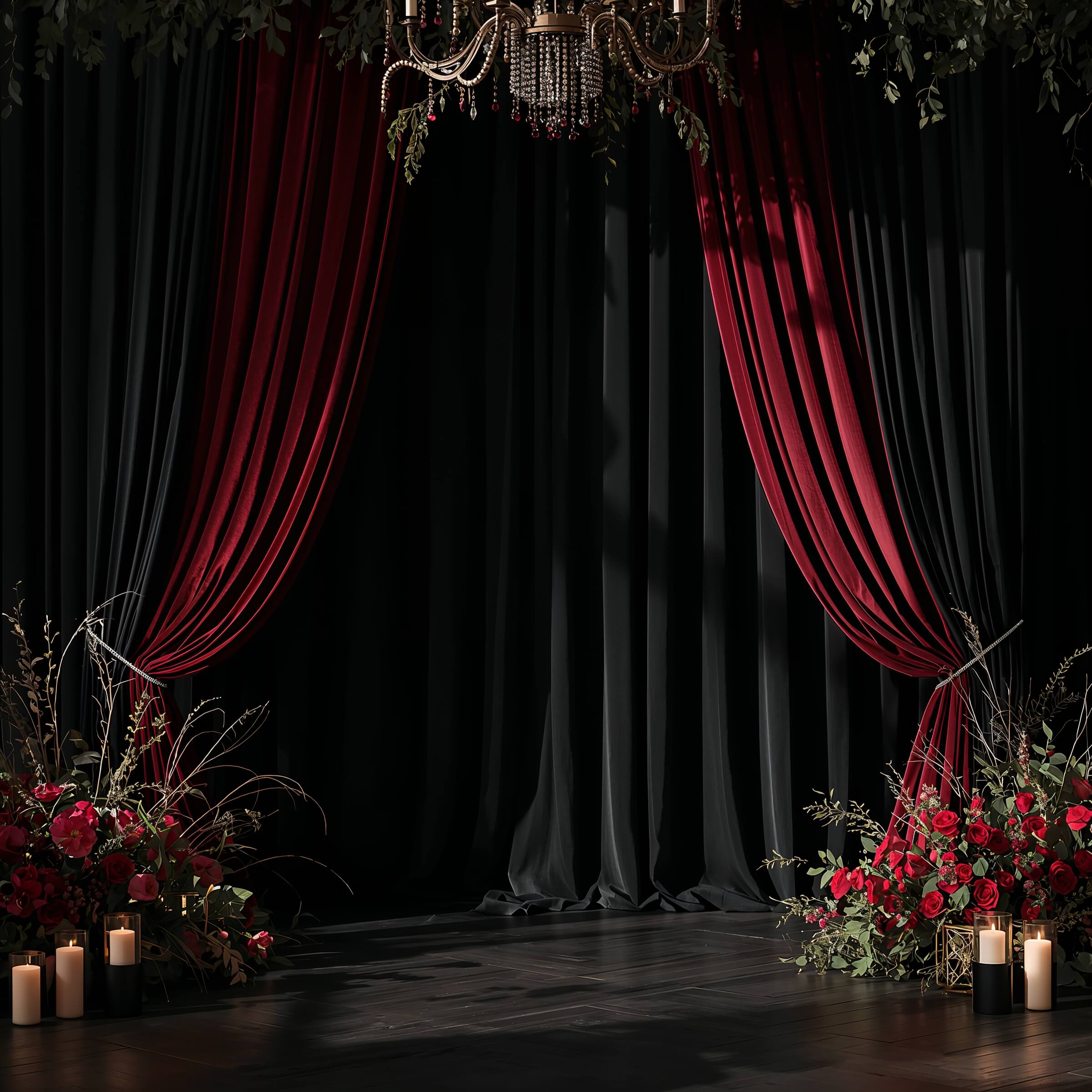 • Dramatic fabric draping: Dark velvet or silk flowing from the arch points