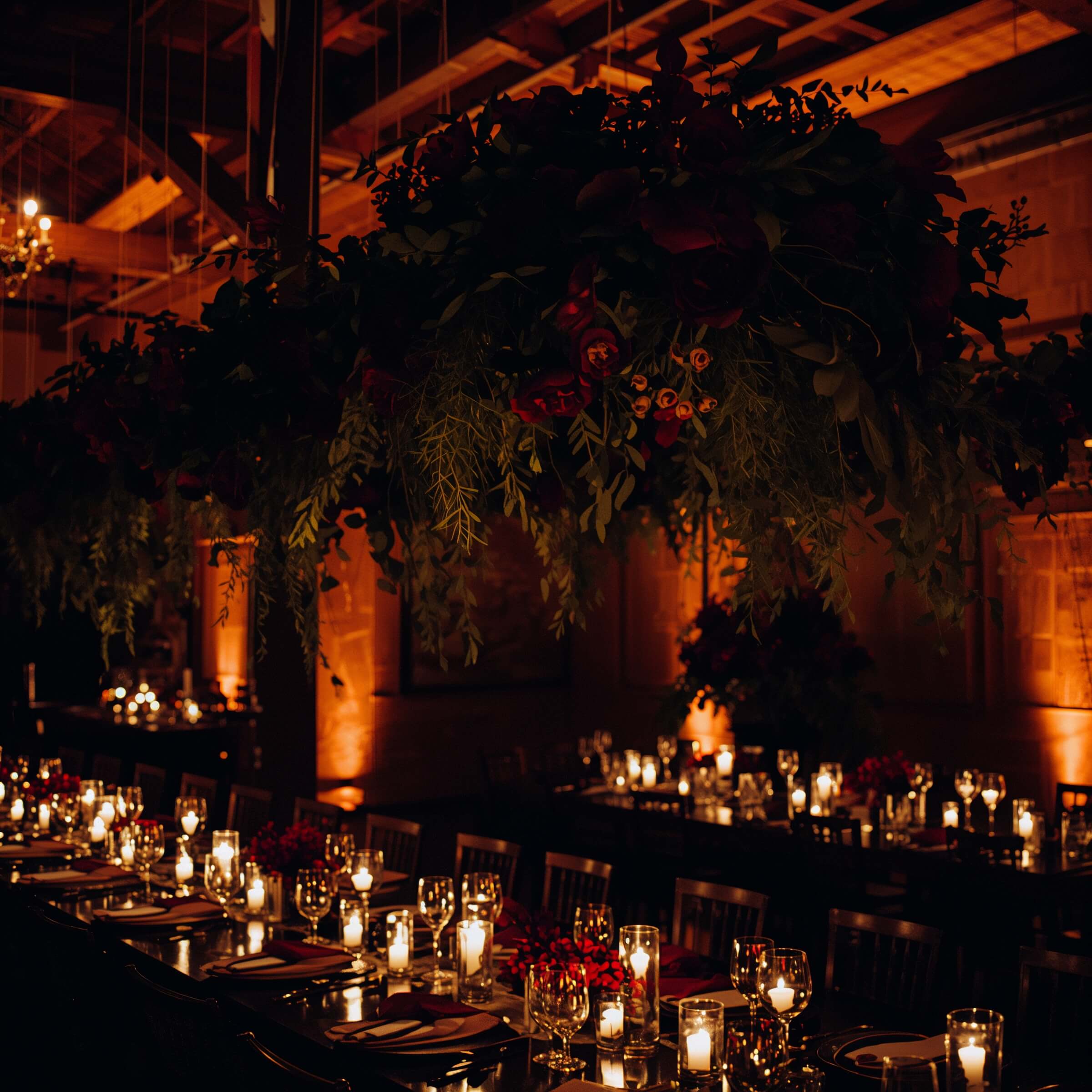 Ever walked into a space and immediately felt like you’d stepped into a fairy tale? That’s the power of overhead floral installations, especially when you go dark and dramatic with your flower choices.