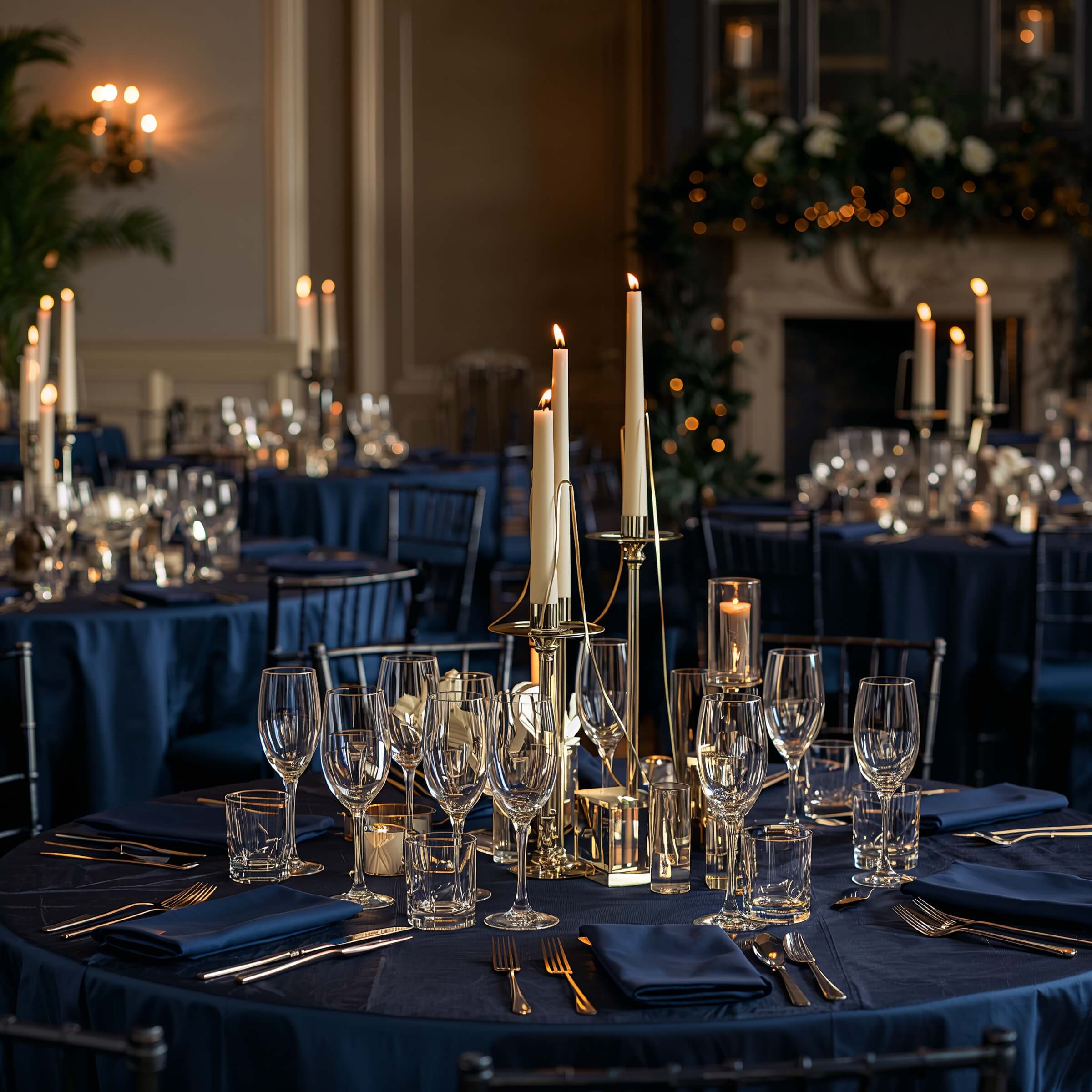 • Linens and fabric: Midnight blue table runners with silver chargers