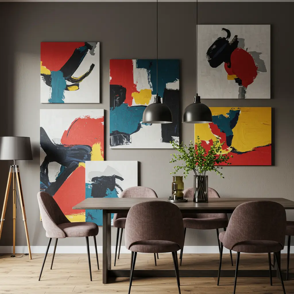 Abstract art succeeds in dining spaces because it adds visual interest without being distracting. You want something that enhances meals, not competes with them for attention.