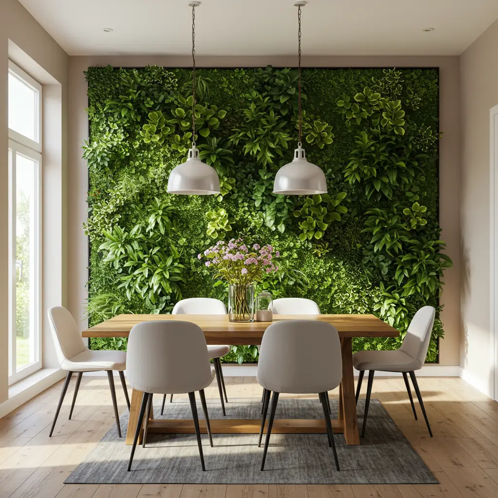 vertical indoor plant wall brings life literally to your dining space. This living artwork purifies air while providing an ever-changing backdrop for meals.