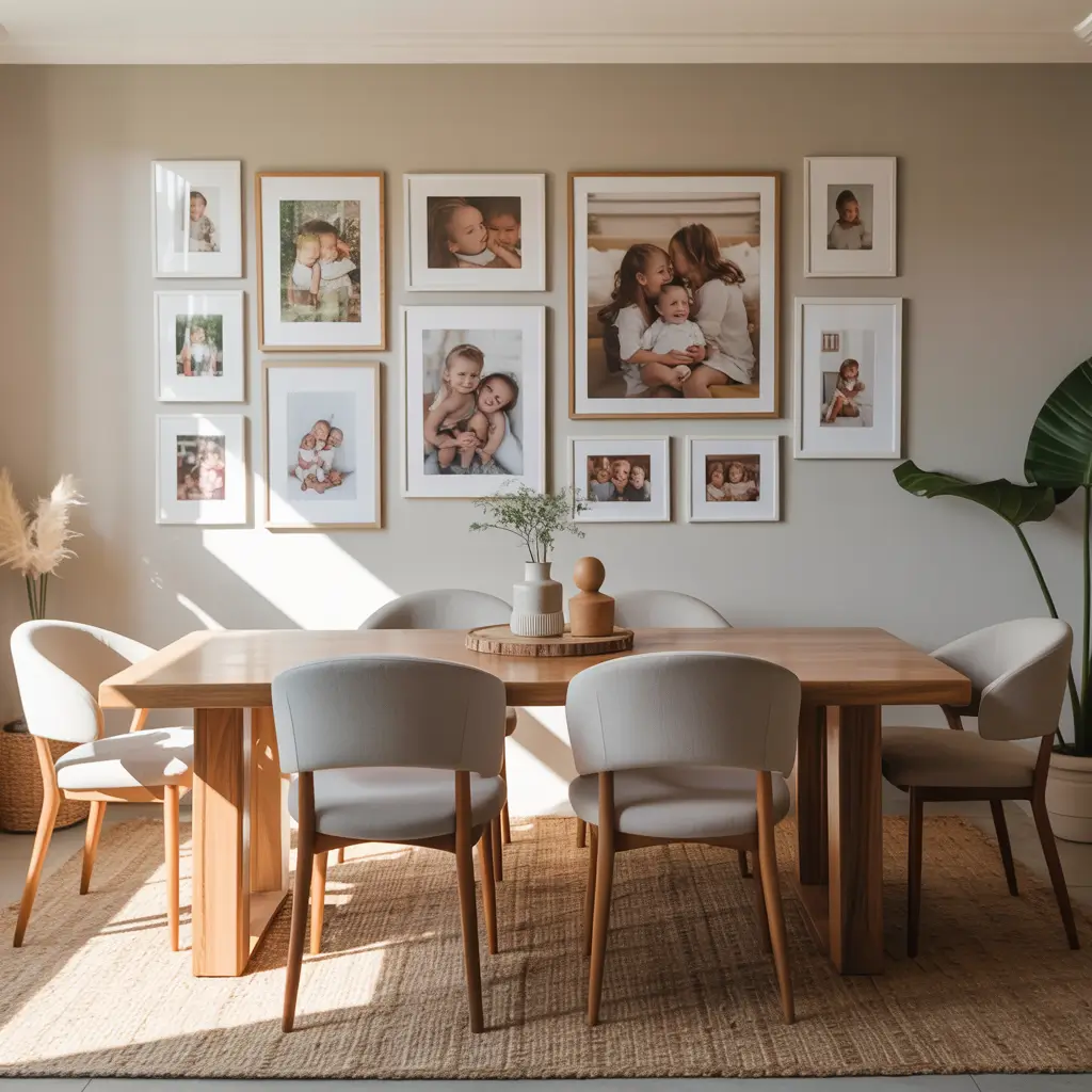 gallery wall with family photos transforms your dining area into a visual timeline of memories. This isn’t just decoration — it’s storytelling that happens to look amazing while you eat.