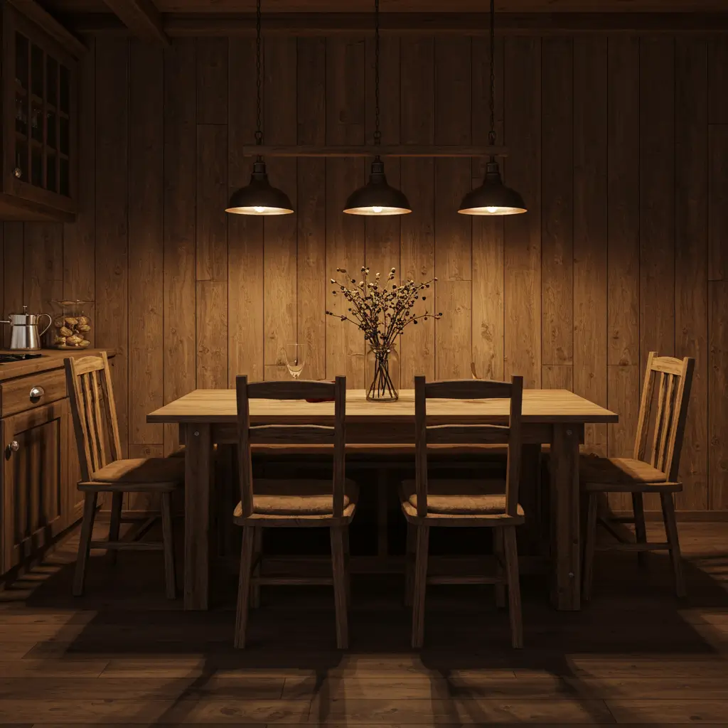 Rustic wooden wall panels add warmth and texture that paint alone could never achieve. This treatment makes dining rooms feel like cozy lodges, even in the middle of the city.