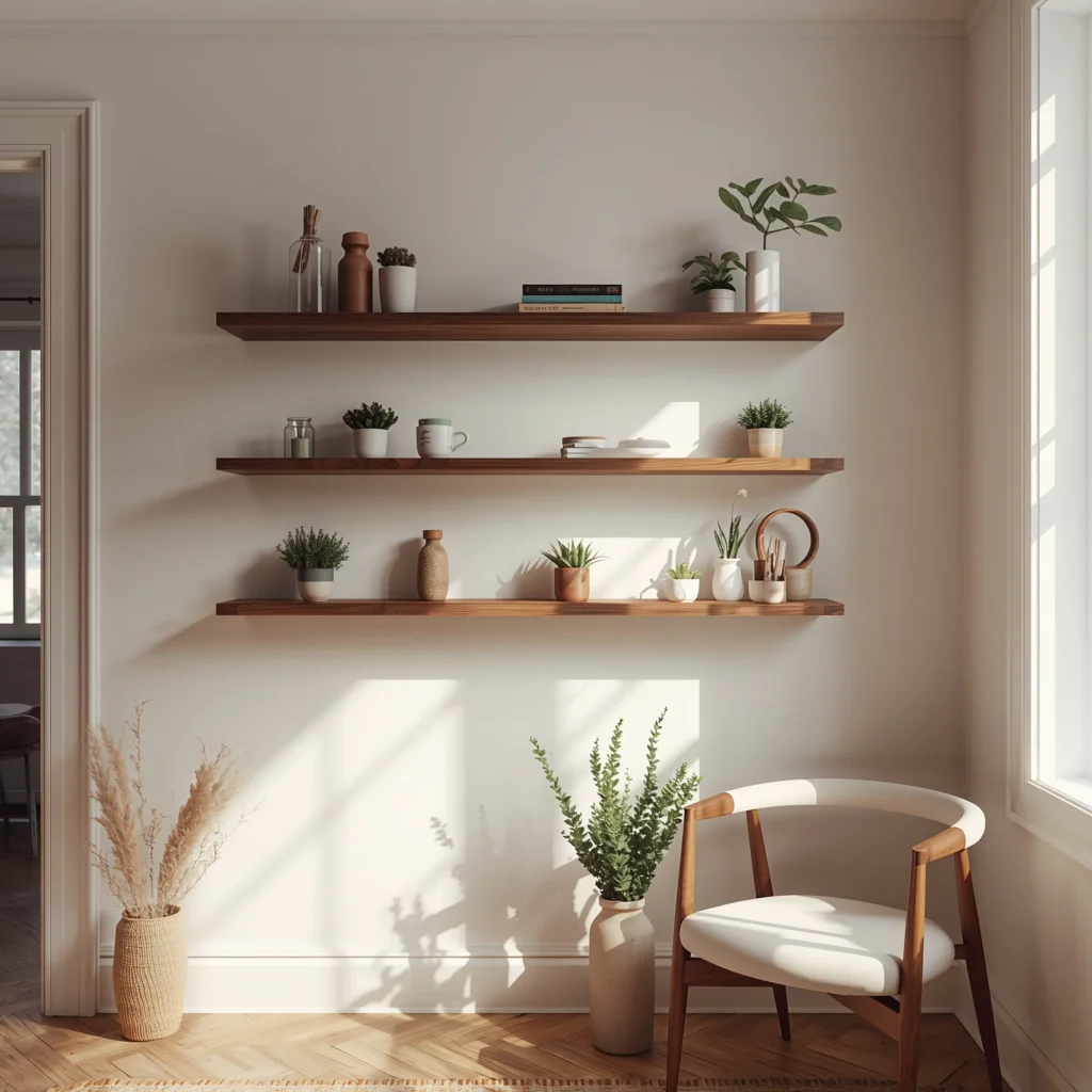 I installed three staggered floating shelves on my dining room’s main wall, and they’ve become my favorite feature. The top shelf houses my trailing pothos (practically indestructible, BTW), the middle showcases a mix of succulents and small framed photos, and the bottom rotates seasonally – sometimes candles, sometimes small sculptures, always interesting.
