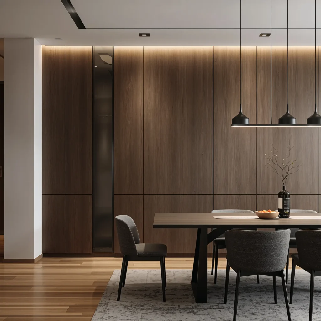 Want to add texture and warmth without going full lumberjack cabin? Geometric wooden panels are your answer. They’re modern, they’re sophisticated, and they make your dining room look like you hired an actual designer.