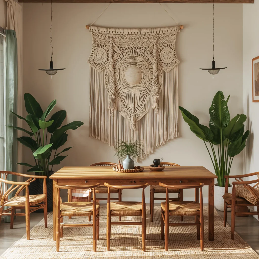 Choose natural cotton rope for that classic look, or go rogue with colored cord. The key is scale – in a dining room, you want something substantial enough to hold its own against your furniture. Think at least 3 feet wide, though bigger is usually better here.