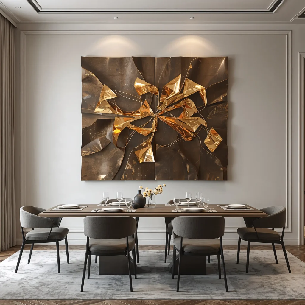 The key with metal art is choosing pieces that complement your dining room’s vibe without overwhelming it. Too much metal can feel cold, so balance it with warm elements like wood furniture or soft textiles.