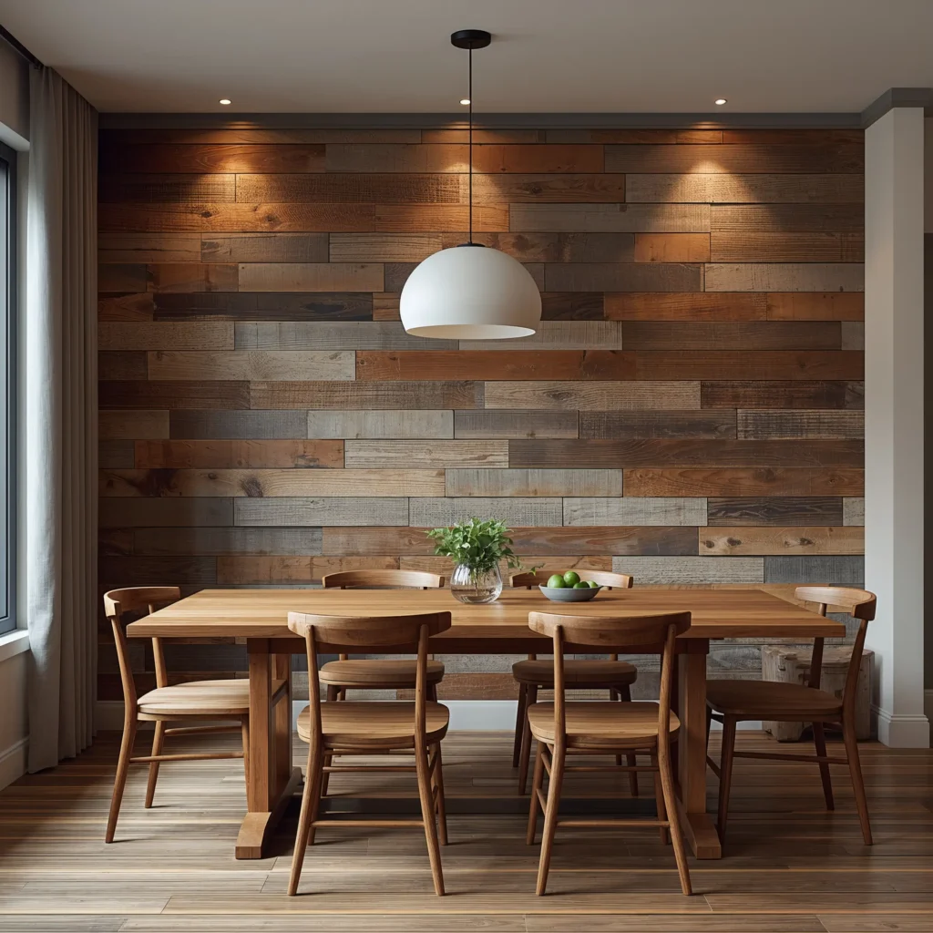 Nothing transforms a dining room quite like a full accent wall, and rustic wood brings warmth and character that paint just can’t match. I used reclaimed barn wood for mine, and every single person who enters comments on it.