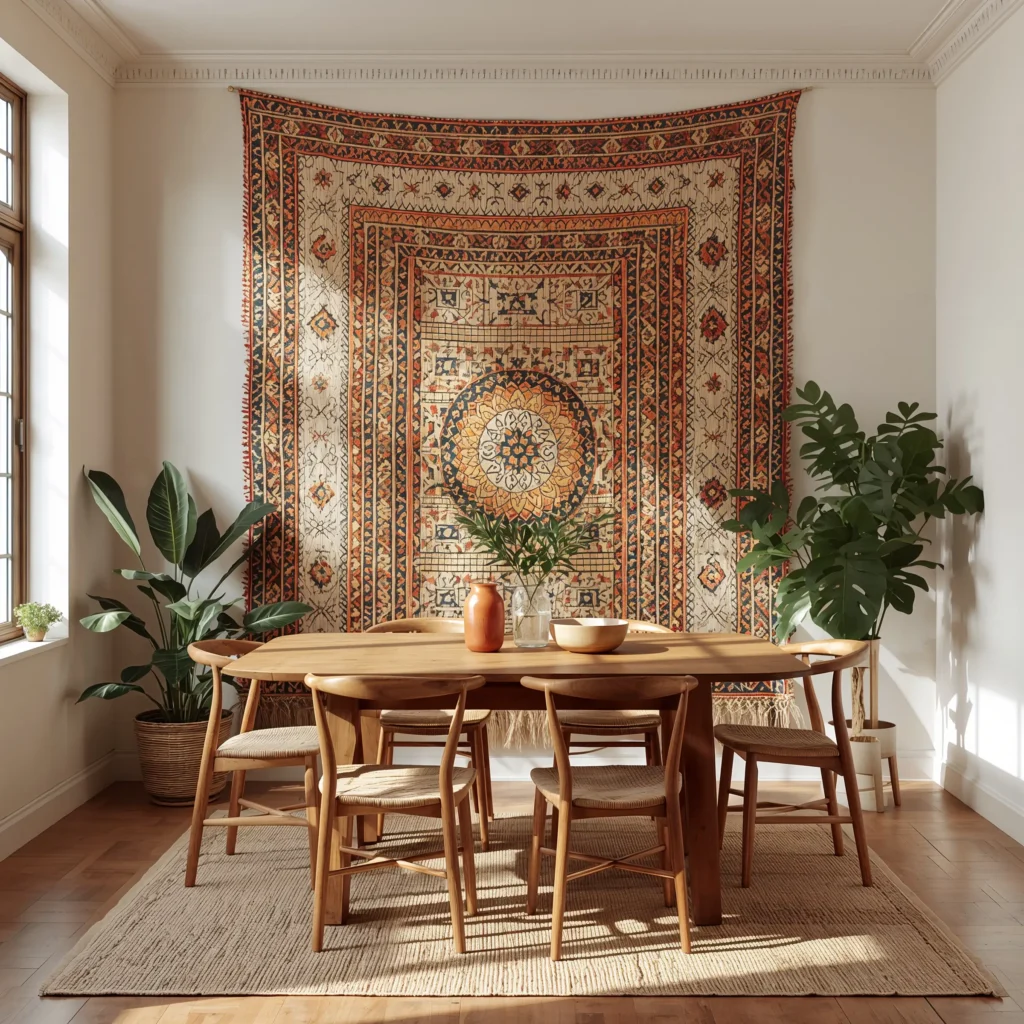 Textile wall hangings add softness and warmth that no other decor can match. Plus, they absorb sound, making dinner conversations more intimate and less echo-y (especially great if you have hardwood floors).