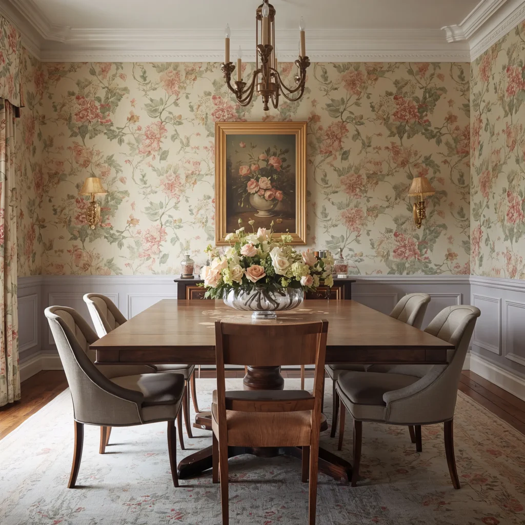 I’m talking about those bold, painterly patterns that look like someone took a giant canvas and wrapped it around your room. These designs work especially well in dining rooms because they create instant atmosphere without requiring you to curate a whole art collection.