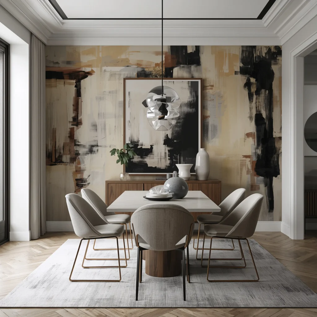 Who says you need to buy expensive artwork when your walls can BE the art? Abstract wallpaper designs turn your dining room into a gallery space where every meal feels like an event.