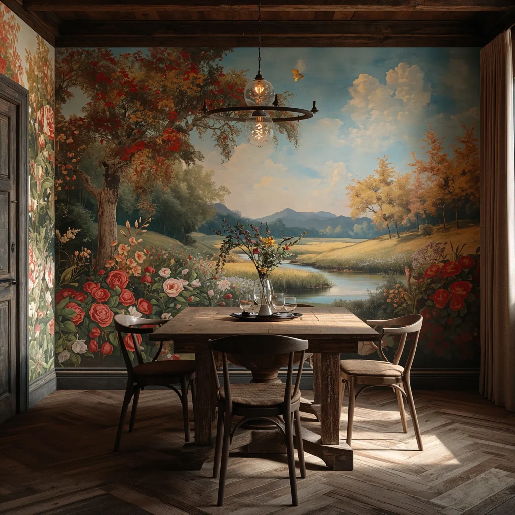 Ready for the ultimate dining room flex? Mural wallpaper turns your walls into legitimate art installations. We’re talking about those stunning scenic designs that make guests forget they’re eating takeout Chinese food.