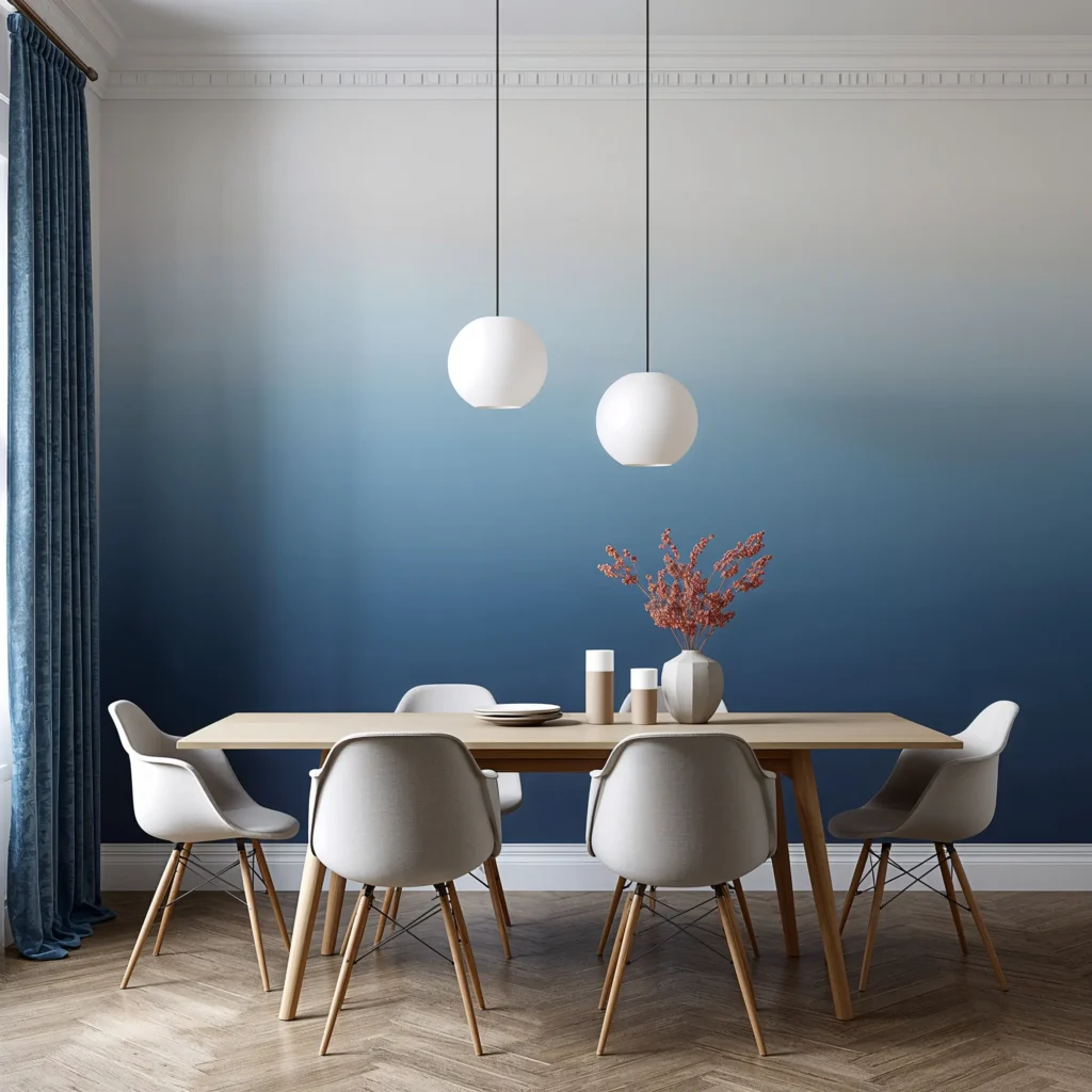 The ombre wallpaper in my powder room (okay, not dining room, but still) goes from deep navy to pale blue. It creates this moody, sophisticated vibe that makes even quick meals feel special.