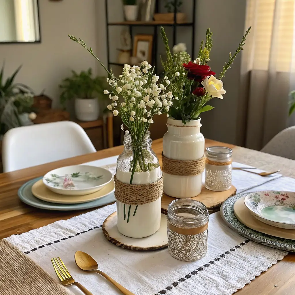 Farmhouse decor thrives on layers and textures. Start with a base layer like a burlap runner or vintage tablecloth. Add height with varying centerpiece elements. Mix materials fearlessly — wood, metal, glass, and ceramic all play nicely together in farmhouse world.