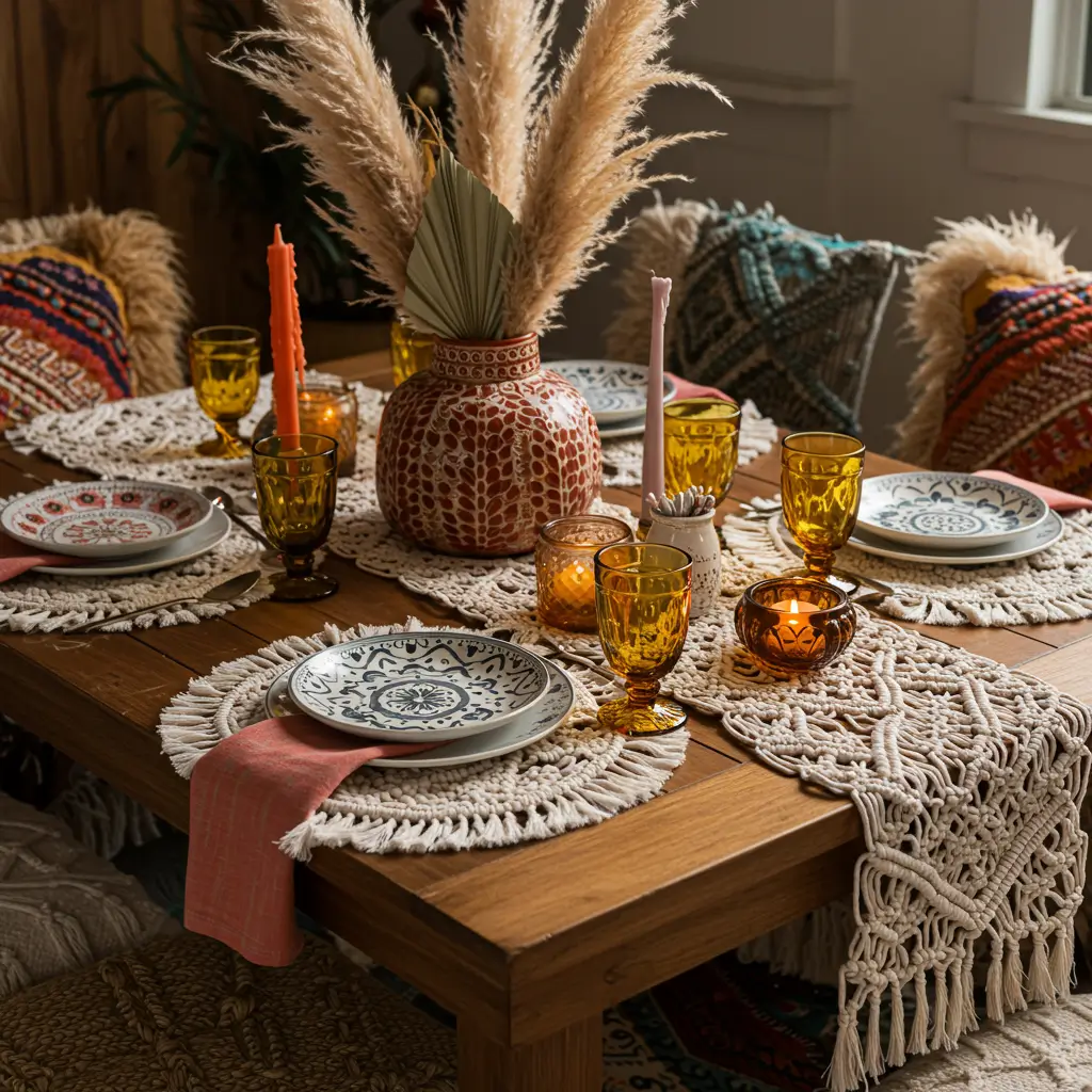 Boho dining table decor celebrates the art of organized chaos. Mix patterns that shouldn’t work, layer textures that clash on paper, add elements from five different continents — somehow it all comes together in perfect imperfect harmony.
