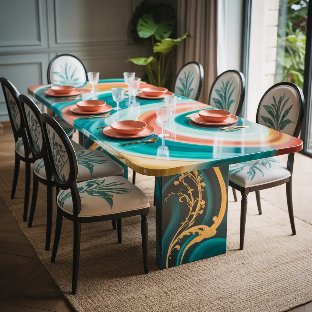After years of safe choices, colorful statement dining tables feel like rebellion. That bright blue table, hot pink base, or rainbow epoxy river table — these pieces dare you to be boring. Sometimes your dining room needs a little chaos.