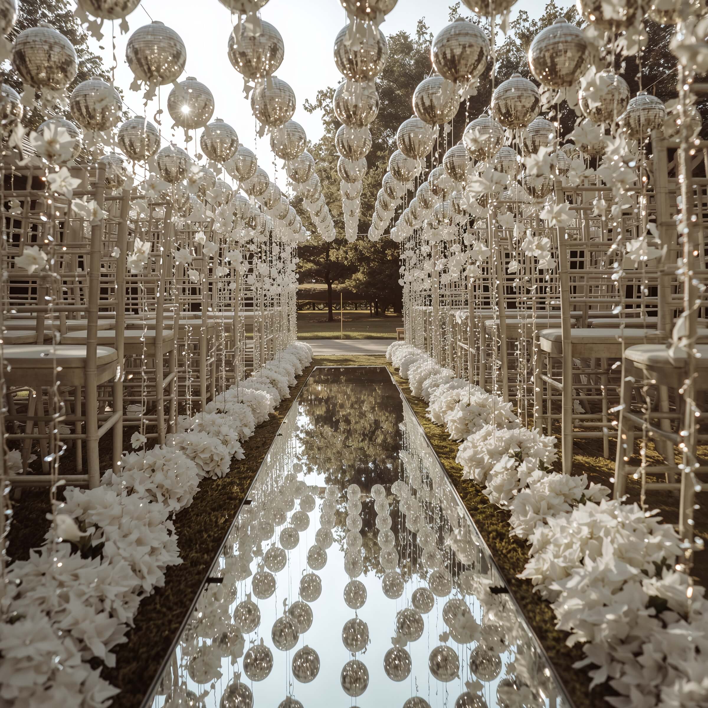 Who says the aisle has to be all roses and baby’s breath? Disco ball aisle decor adds unexpected glamour to your walk down the aisle, and I’m here for every sparkly second of it. Picture small to medium disco balls hanging from shepherd’s hooks along your aisle, catching the light as you make your grand entrance.