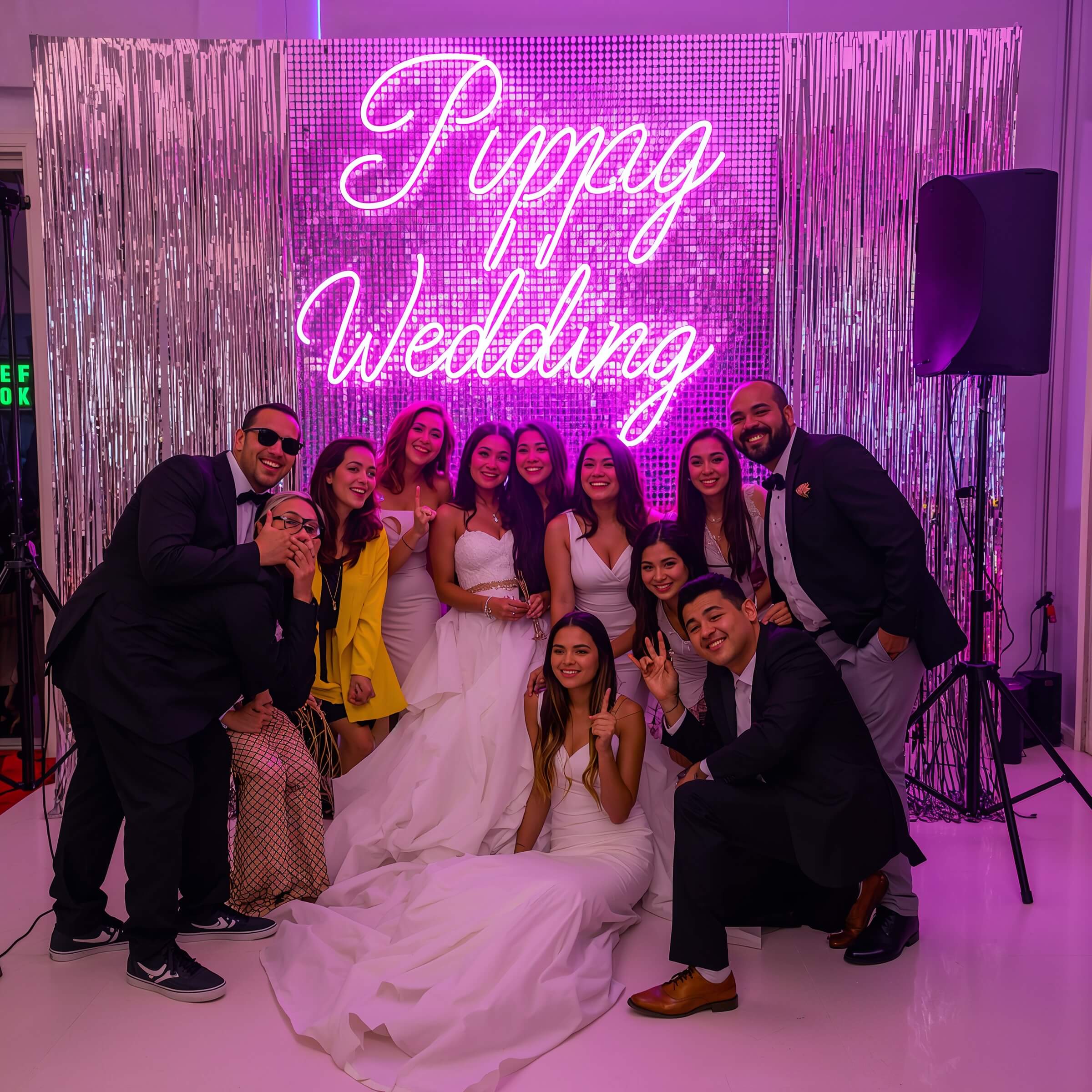 Picture this: disco balls hanging above your bar area, casting sparkles across bottles and glassware, while a custom neon sign (maybe your new last name or a fun phrase like “Let’s Get This Party Started”) provides that perfect pop of color and personality. The contrast between the warm glow of neon and the cool sparkle of disco balls creates visual interest that photographs beautifully.