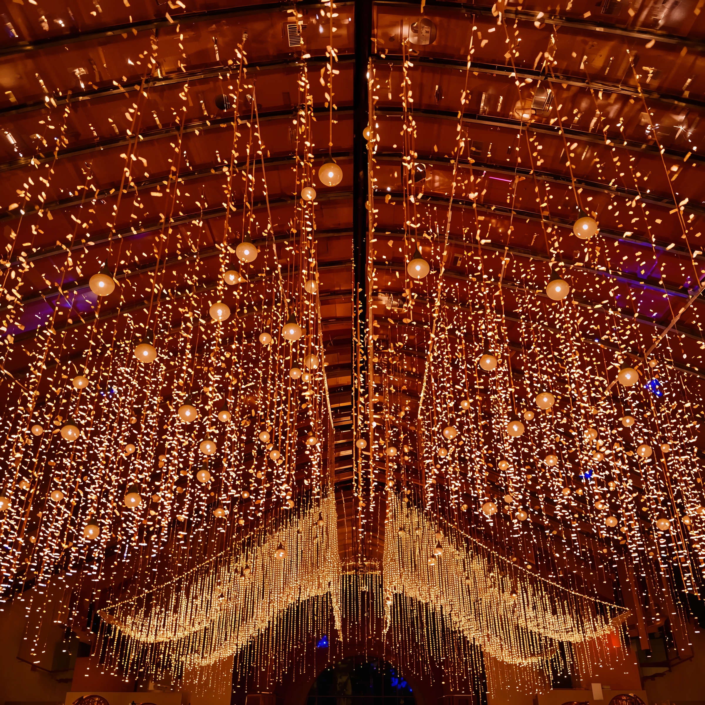 Ready to create something that’ll make your guests’ jaws drop the moment they walk into your reception? A disco ball ceiling canopy is basically like hanging the night sky, but make it sparkle. This is next-level wedding decor that transforms any venue into something extraordinary.