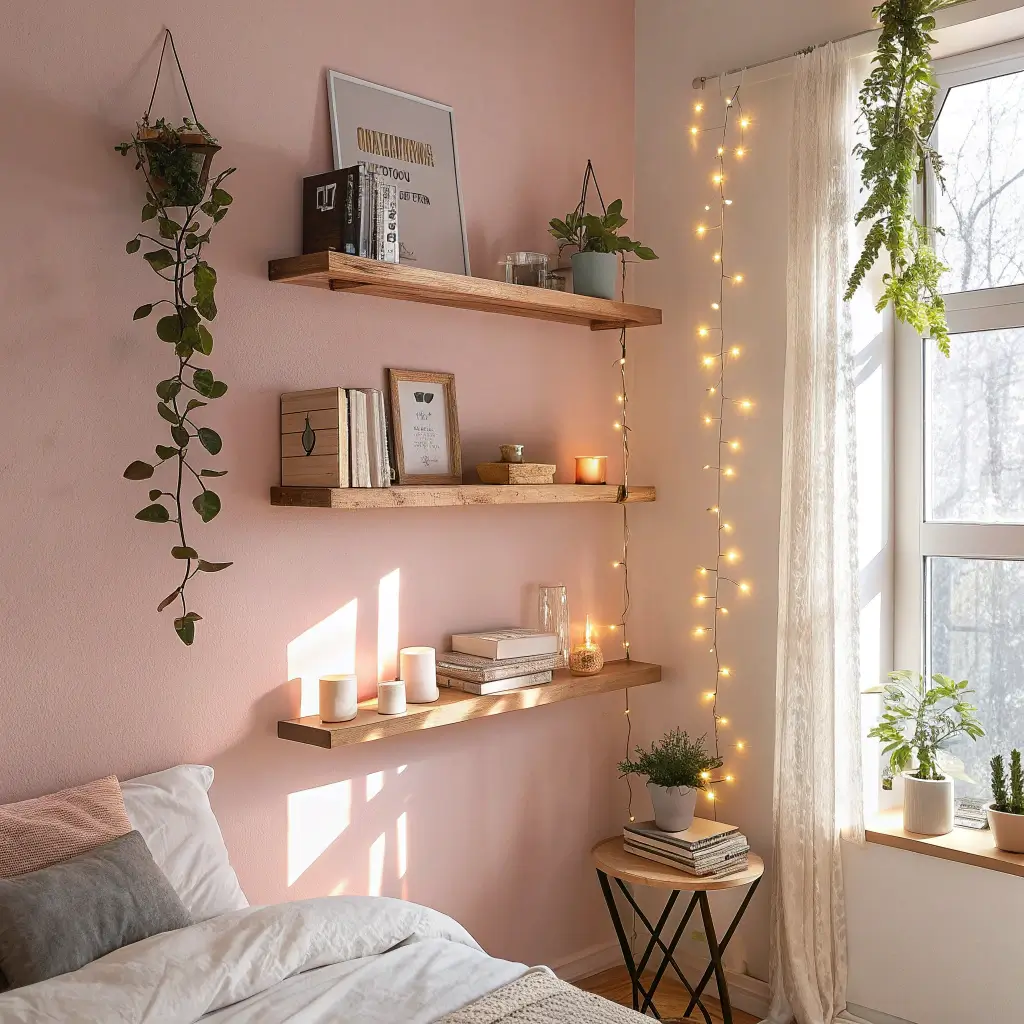 Floating shelves with integrated lighting solve two problems at once—storage and ambiance. The shelves display your carefully curated items (books, plants, that vintage camera you never use), while the fairy lights add that soft, Instagram-worthy glow that overhead lighting could never achieve.