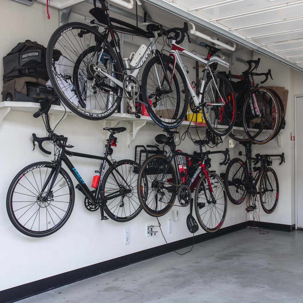 Also, consider the path of travel in your garage. Don’t hang a bike directly over the walkway to your house door unless you enjoy the thrill of dodging pedals every morning. Place ceiling-stored bikes over your car’s hood or along the side walls where they won’t interfere with daily movement.