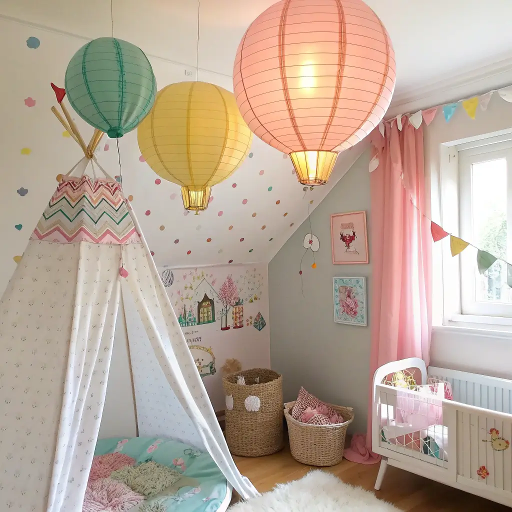 Hot air balloons represent adventure and dreaming big—perfect themes for a kid’s room. Creating hot air balloon decorations from paper lanterns is easier than it sounds and creates this whimsical floating effect that kids absolutely love. Plus, they add dimension to the room by utilizing that often-ignored vertical space.