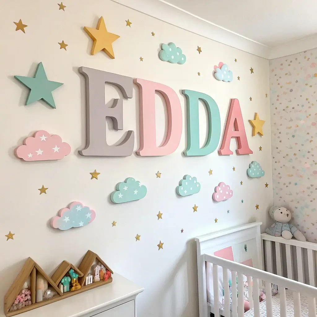 Mount the letters directly on the wall above the bed or dresser using command strips. You can also stand them on shelves or the top of a bookcase if you prefer not to put holes in walls. Some people string letters together and hang them like a banner, though that works better with lighter materials.