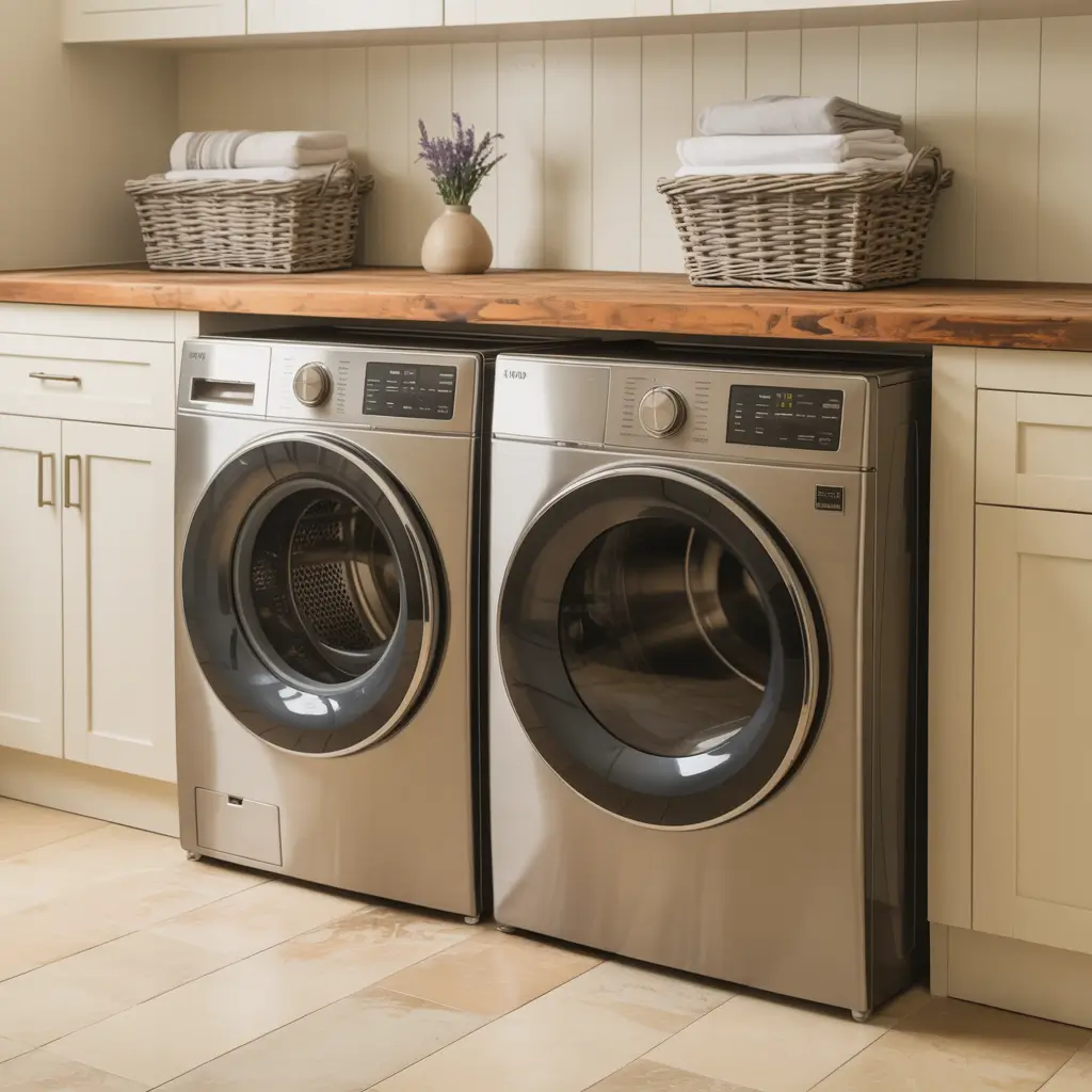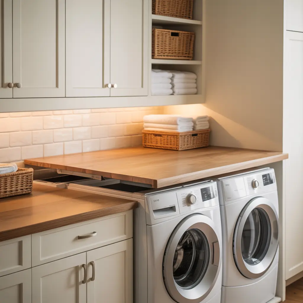 I built a custom butcher block countertop that spans both machines for about $60. Home improvement stores will cut the wood to size, so don’t worry if you don’t own a saw. Secure it with heavy-duty adhesive strips – no drilling required if you’re renting. The smooth surface makes folding a breeze, and it looks way more expensive than it actually costs.