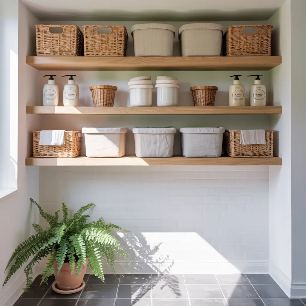 Floating shelves make everything look expensive and organized, even when you’re basically just hiding your mess in pretty baskets. I installed three 24-inch floating shelves for under $50, and they hold everything from detergent to that random collection of orphan socks.