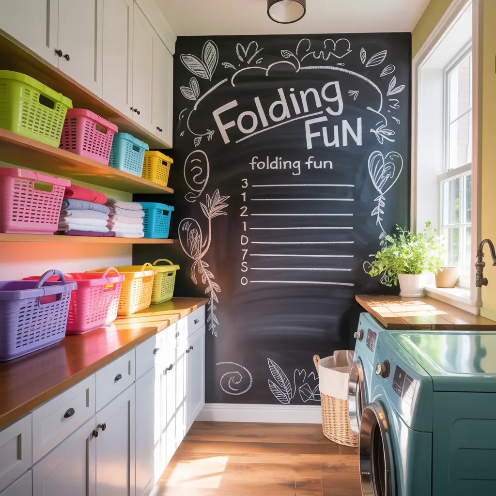 Transform one wall into a giant chalkboard for the ultimate family communication center. I use mine for stain treatment reminders, washing instructions for delicate items, and passive-aggressive notes about whose turn it is to switch the laundry.