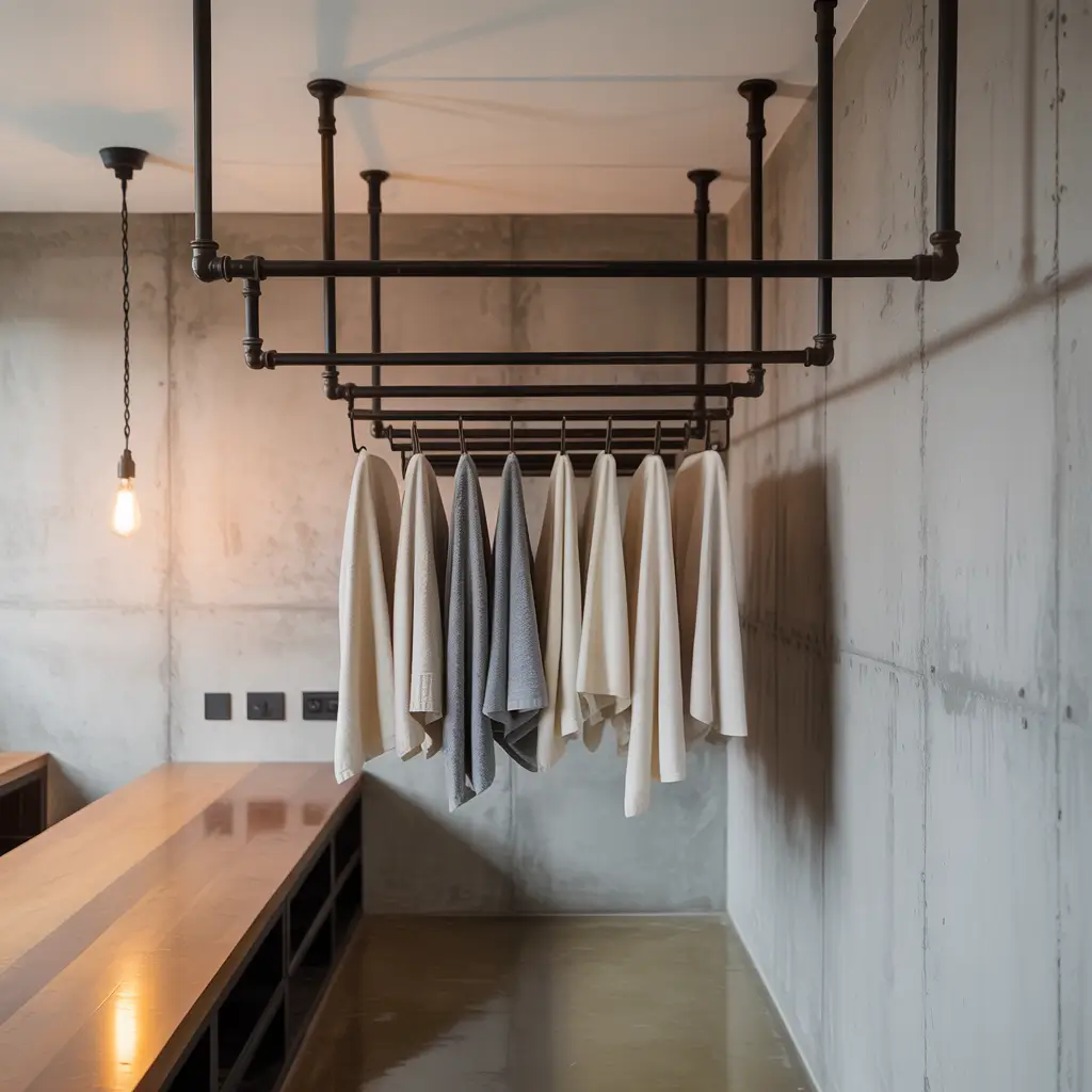 I built mine using two vertical pipes attached to the wall with flanges, connected by a horizontal pipe for hanging. The industrial look adds edge to an otherwise boring space. Plus, it holds wet clothes like a champion – I’ve tested it with heavy jeans and soaking wet towels.
