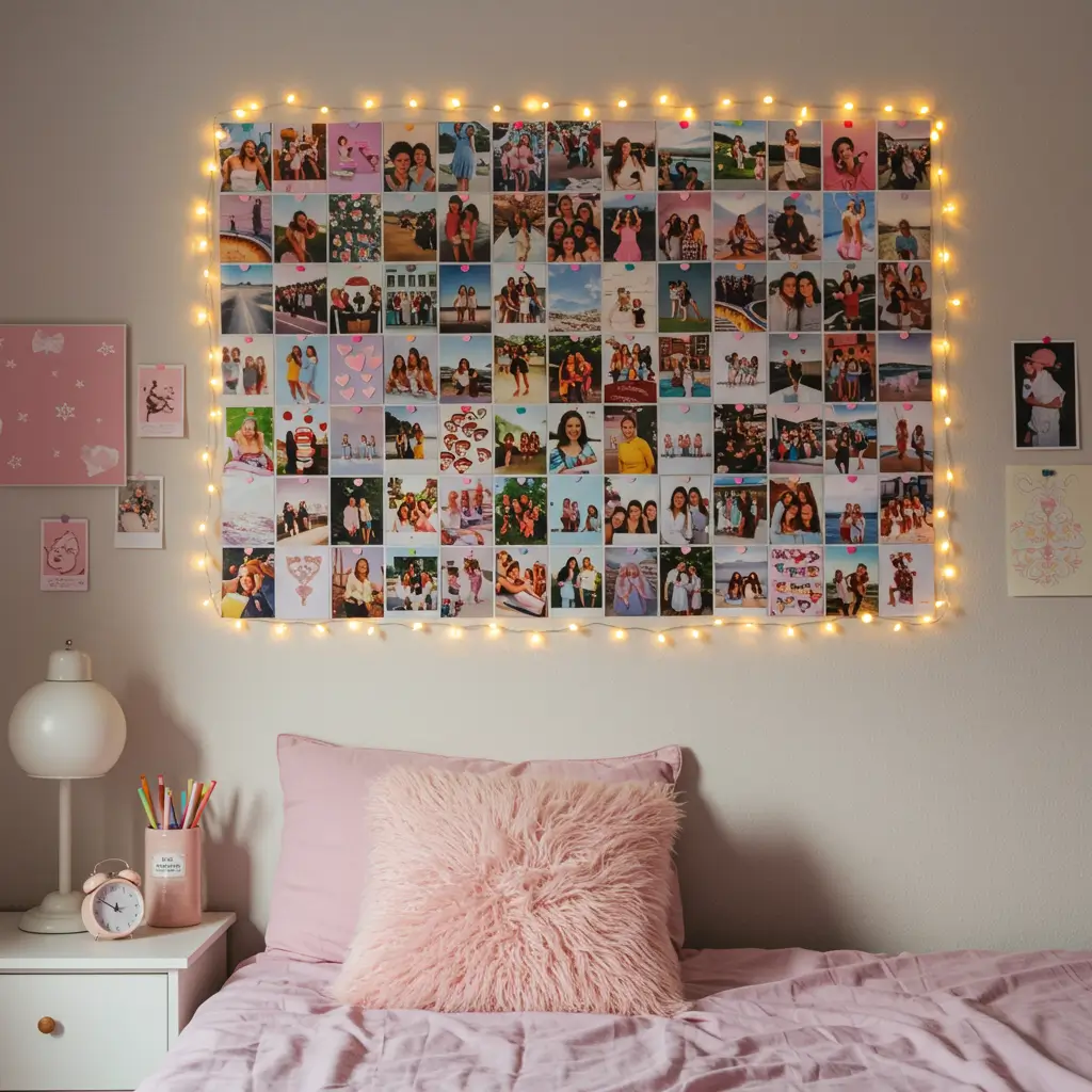 Photo collages make your space uniquely yours in a way that store-bought posters can’t. Every image tells a story, and arranging them creates a visual diary of your life right now—friends, concerts, random adventures, embarrassing moments you’ll somehow treasure later.