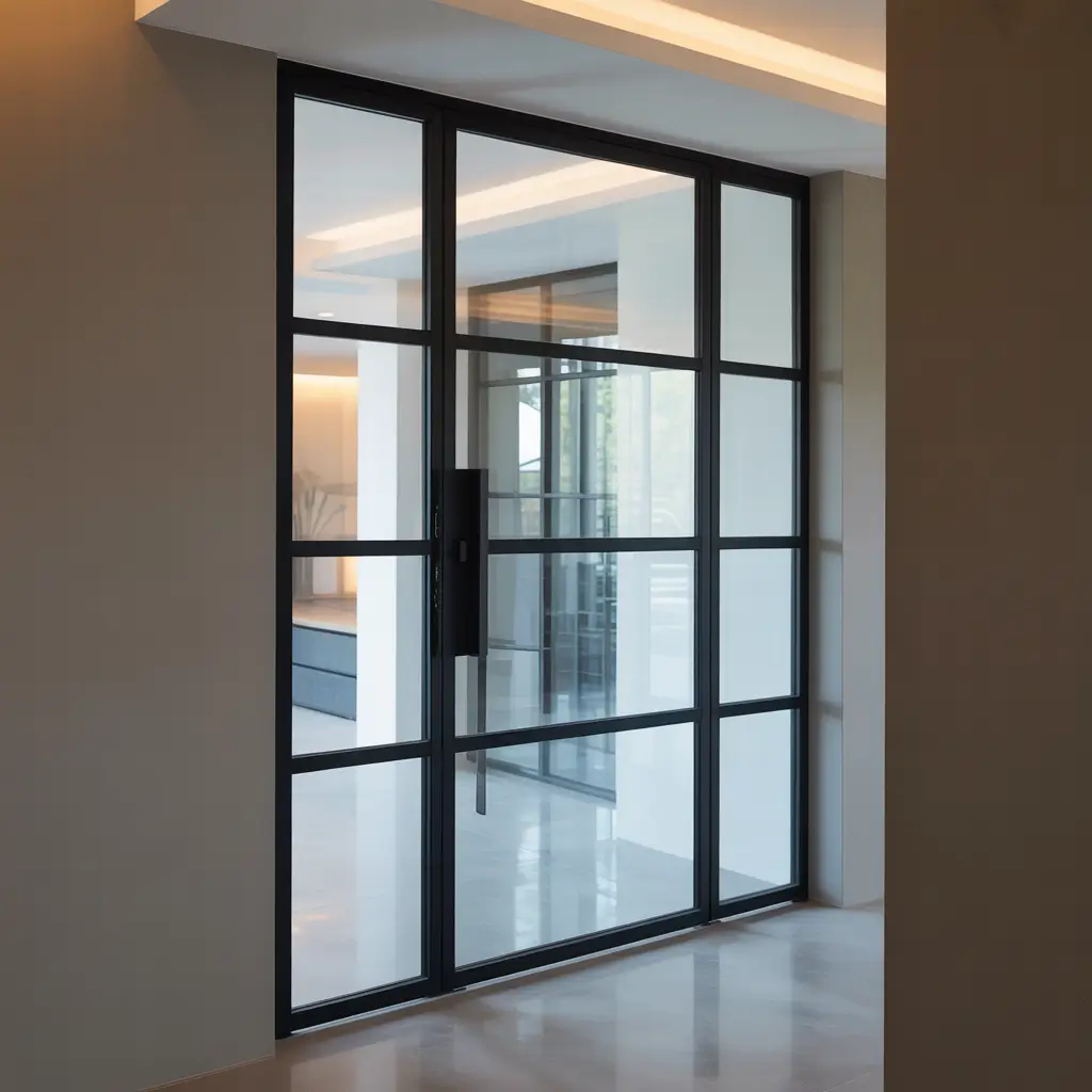 Metal frame doors reference commercial and industrial spaces while maintaining residential appropriateness. The thin metal profiles maximize glass area while providing structure and style that feels both raw and refined.