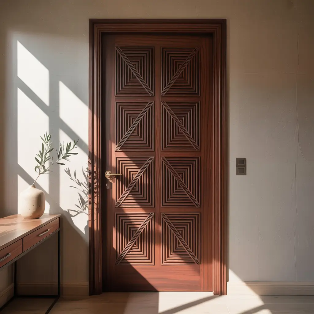 The pattern scale dramatically affects the door’s impact. Small patterns create texture and richness up close, while larger patterns read from across the room. Consider your viewing distance when designing geometric patterns.